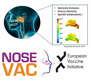 We are participating in the European NoseVac consortium, which brings together 11 teams in Europe to develop nasal vaccines to protect against Bordetella infections. We thus characterize host-pathogen adaptation to understand changes in the bacterial and eukaryotic transcriptomes and proteomes during infection, particularly during the initial stages of colonization in the nasal cavity where temperatures are between 32 and 35°C and presenting various concentration of nutriment i.e. transition metal concentrations.